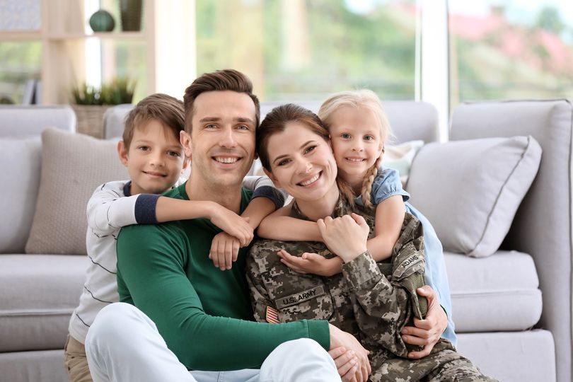 Woman in military uniform with her family at home