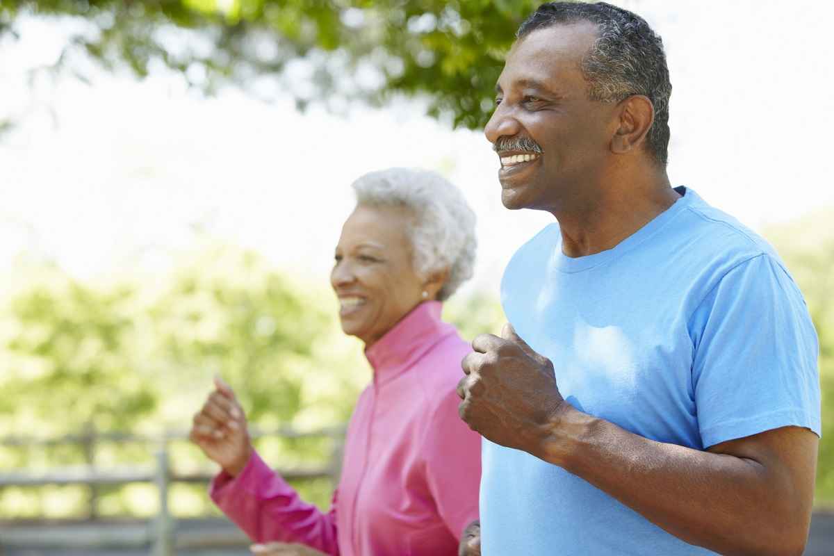 Older couple jogging while smiling